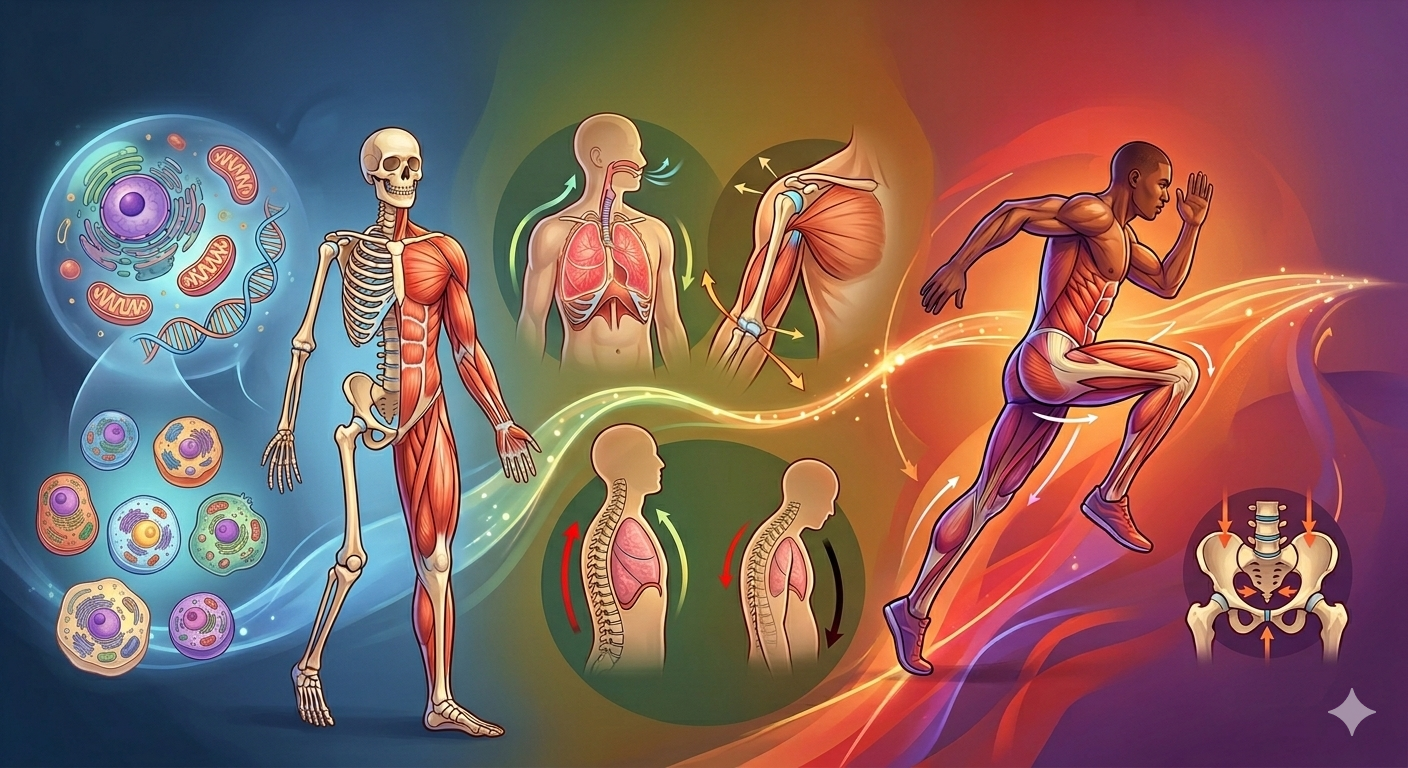 Niveles de organización biológica del cuerpo humano y su interacción como sistema integrado. Introducción a la epigenética. Fundamentos de biomecánica: eficacia, eficiencia y efectividad aplicadas a la actividad física. Posición anatómica, planos, ejes y terminología de relación y comparación. Sistema óseo: clasificación, tipos de tejido, adaptación a la actividad física y fuerzas mecánicas sobre el hueso. Sistema articular: tipos de articulaciones según tejido, forma y función; estructuras articulares y evaluación de la movilidad. Sistema muscular: estructura, tipos de fibras, fascias, tono muscular, cadenas miofasciales y diseño de ejercicios para la mejora de la movilidad y la fuerza.